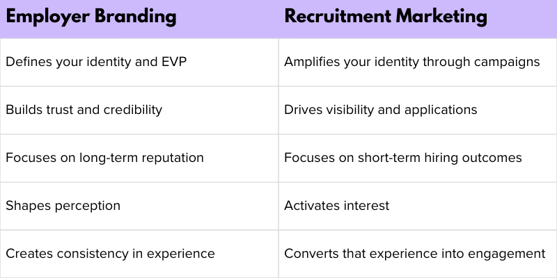In essence, employer branding attracts interest, and recruitment marketing drives action. When both are working in sync, you stop chasing candidates and start consistently attracting the right ones.